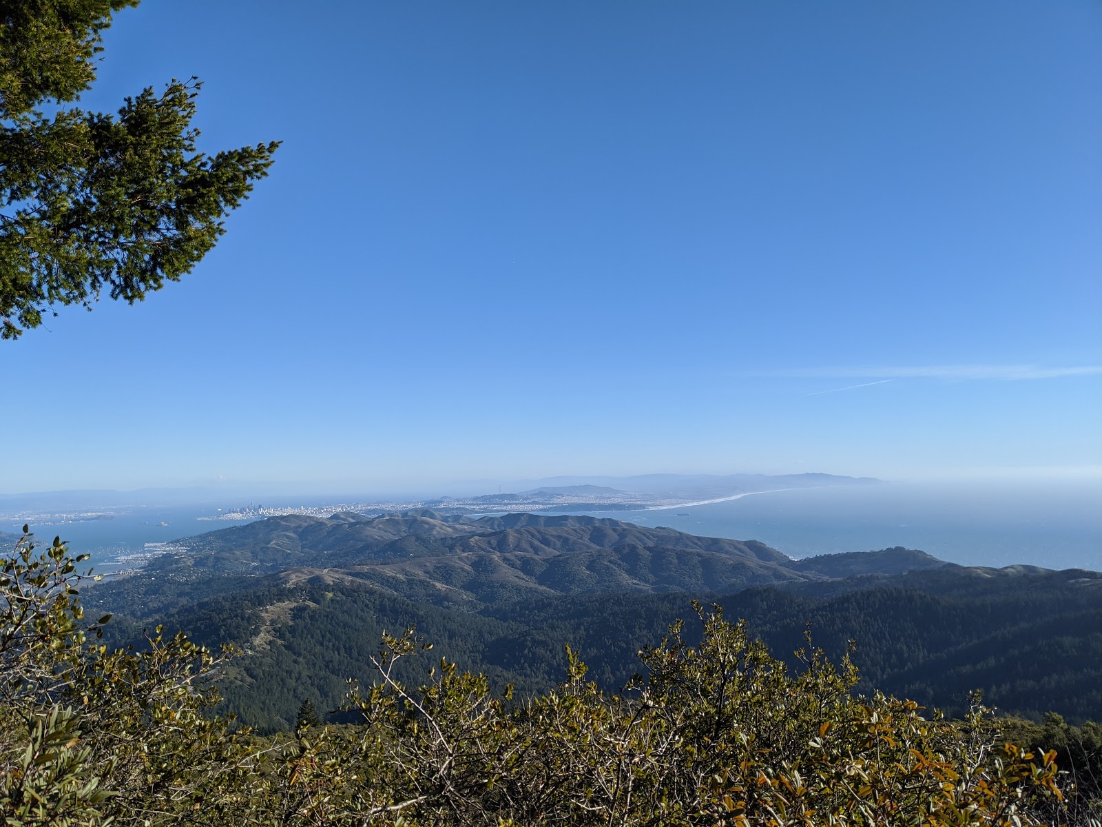 | Right after I snapped this pic, I rolled toward the cars in the middle left and a very healthy, nonchalant coyote walked right across the road in front of me, then loped down the hill to my right. I've seen coyotes and bobcats here several times. Also, I saw another cyclist. I said "Beautiful!" and he replied "Yes! I just rode from Oakland!" Me, "Me too! I came from near Joaquin Miller Park!" Turns out we were doing very similar rides; he counter-clockwise, me, clockwise. "Good job, buddy!" I said. Should have snapped a pic of him, told him my name. I later ran across Steffan, also doing a giant loop from Oakland. |